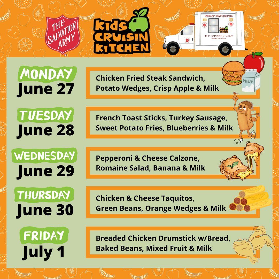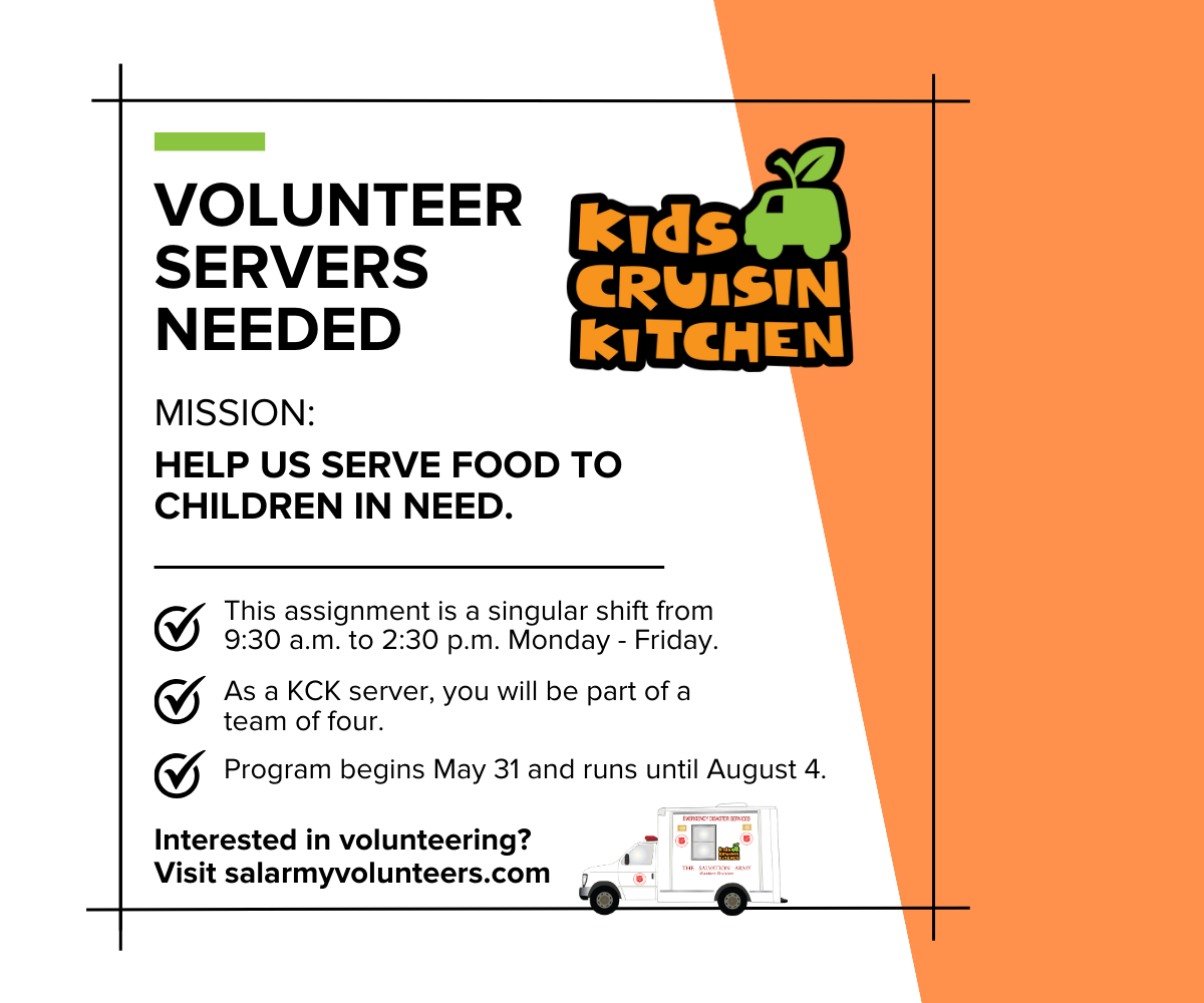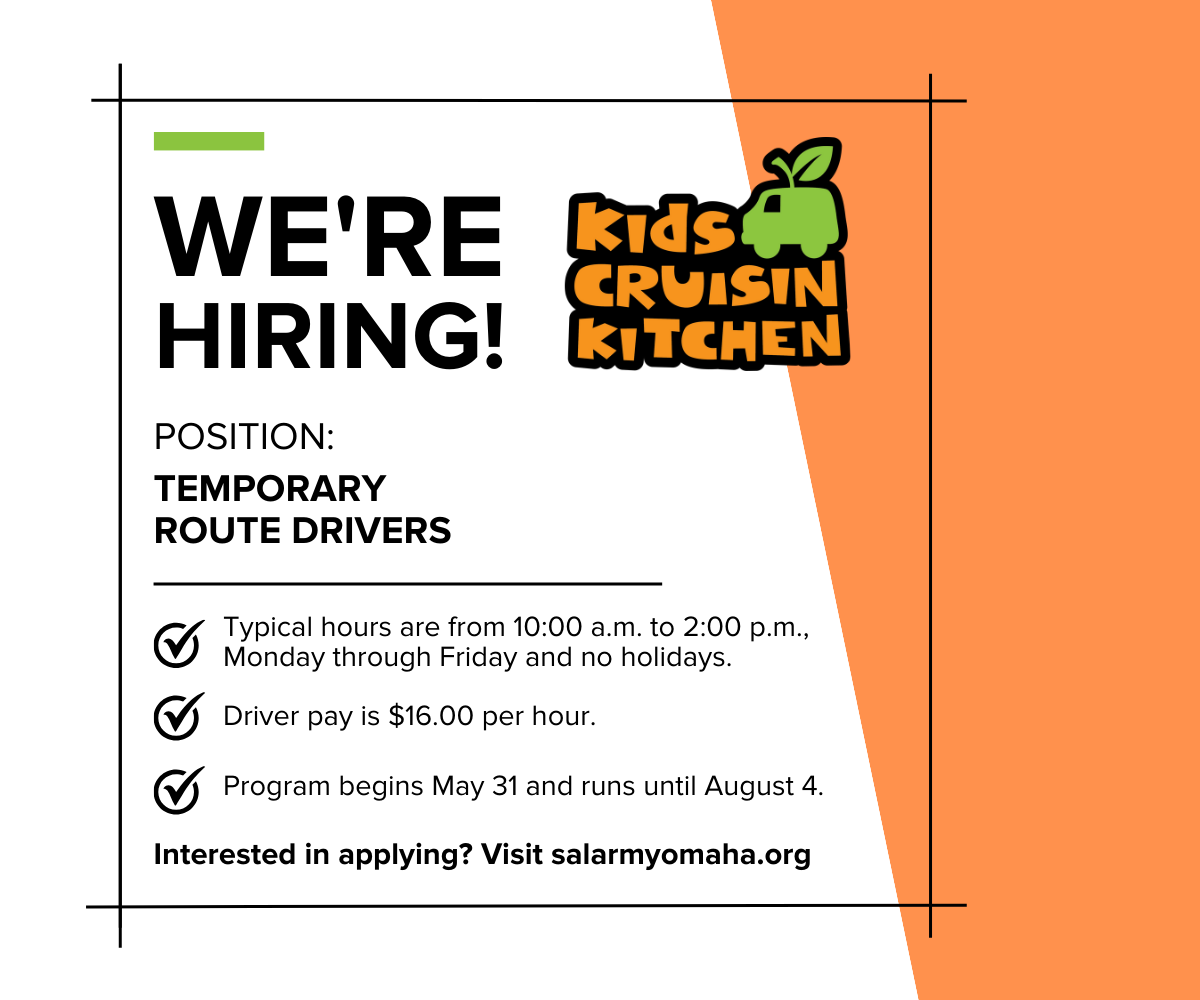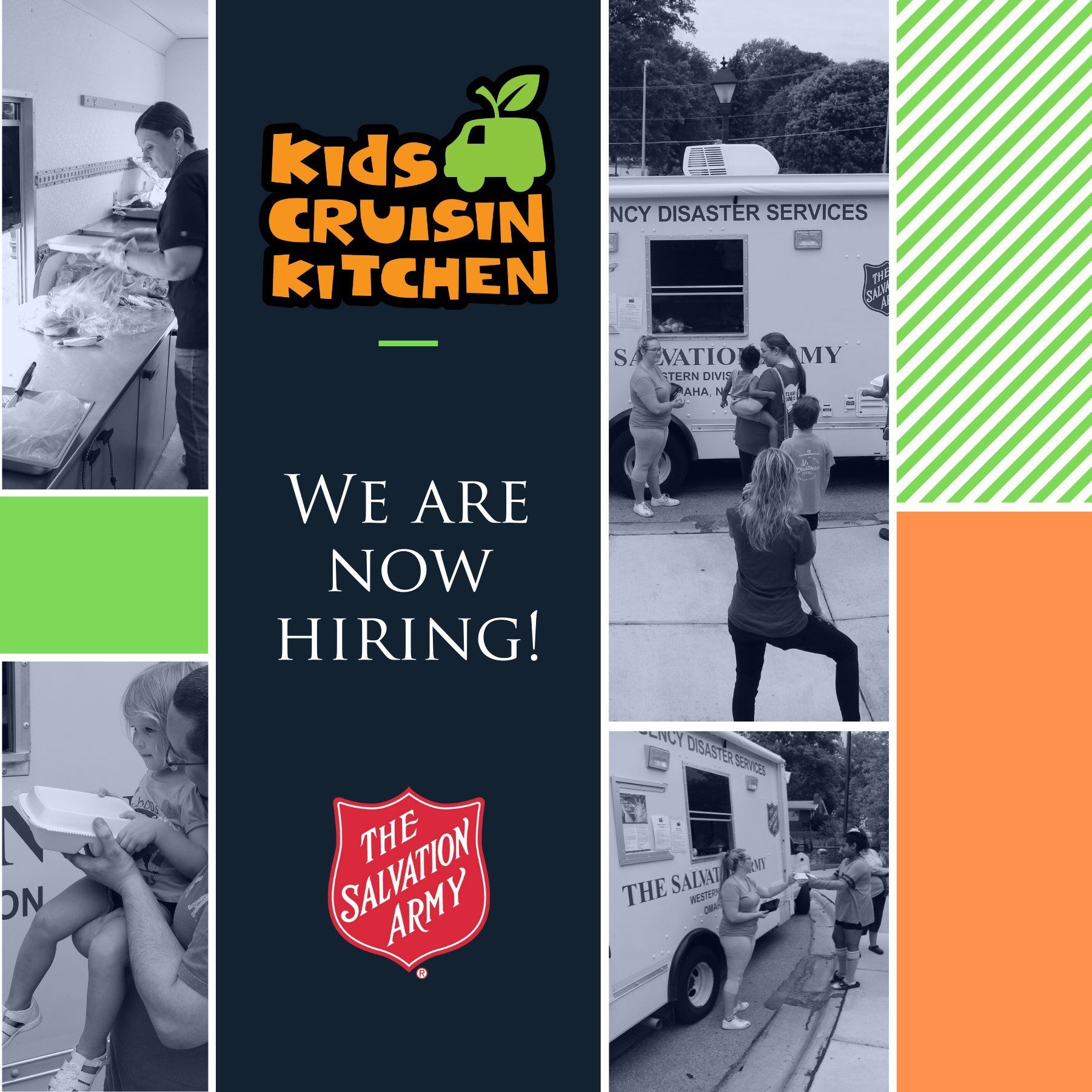 In Nebraska, 1 in 6 children is considered food insecure, which means they might not know where they will get their next meal. Summer is a particularly challenging time because kids aren’t eating meals in school and parents often struggle with additional food and child care costs. The Salvation Army's Kids Cruisin' Kitchen program helps bridge this gap for these families by serving meals to kids in need via their mobile canteens (food trucks), which travel around to various locations throughout the Omaha metro area. Each year, I am tasked with developing graphics/imagery to promote this program and inform the Omaha community about volunteering and job opportunities, the lunch menu and location schedule for each week during the summer months.
