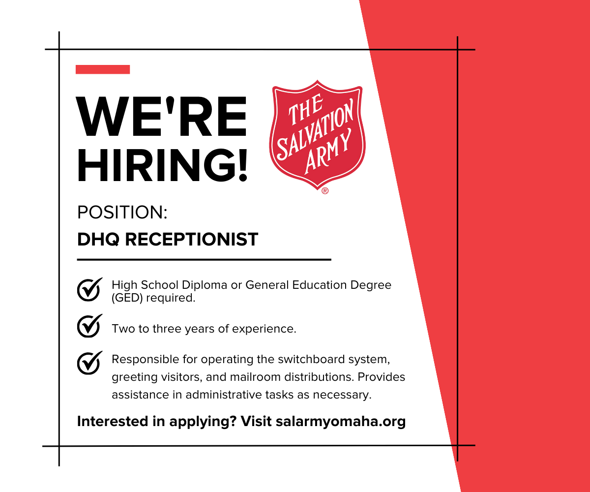I often collaborate with HR, the Volunteer Department and other departments/teams on special initiatives relative to recruitment and hiring to promote available job positions and volunteering opportunities. These efforts chiefly involve creating graphics/imagery and copy for social media posts. I strive to maintain a consistent brand look across all Salvation Army social media channels while also conveying the most important information in a clear and concise manner.
